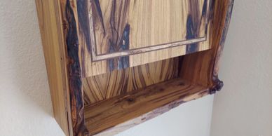 This small cabinet was custom designed and built for a family ranch in Purcell, OK. The redbud wood for this piece was felled, milled, dried, and crafted in Stillwater and Guthrie (rough milling done in Guthrie at Gooch Sawmill). We chose the redbud for this project because it is Oklahoma's state tree, and just so happened to also have a pleasant yellow color along with spalting. The yellow provides a great contrast for the wenge inlays bordering a spalted maple inner inlay.