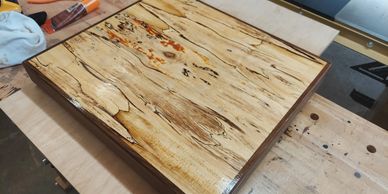 Excess from the top was trimmed off, blue-dyed curly maple edge banding applied, and then finish could begin. We chose epoxy for the top due to the softness of pine. Having nearly 1/8" of clear plastic protecting the color and helping reduce dents is sometimes beneficial. The base was dyed black and top coated with satin polyurethane. I also used a little bit of scrap material to make a matching serving board.